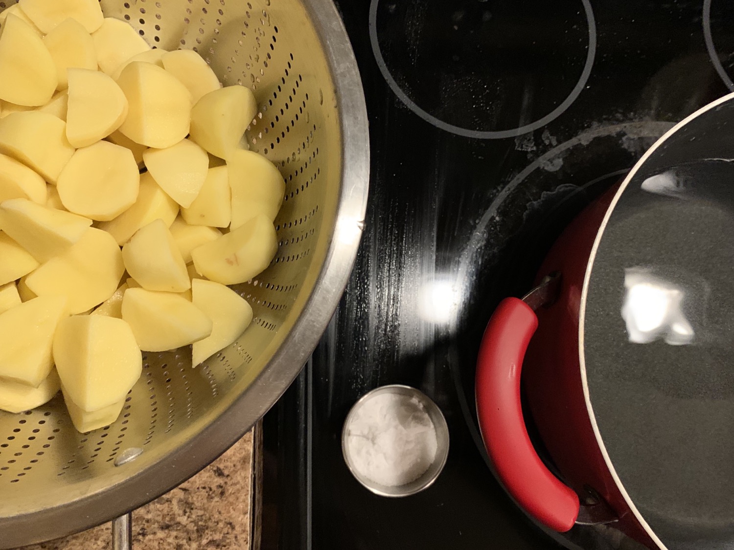 As I said, it begins like a lot of other potato recipes, peeling the potatoes and cutting into chunks. It then gets a quick 10 minutes or so into the boiling water mix. You don't want to completely boil them here as they'll do another 50-60 minutes in the oven. You just want to get them soft enough to get the outer surface mushy a bit.