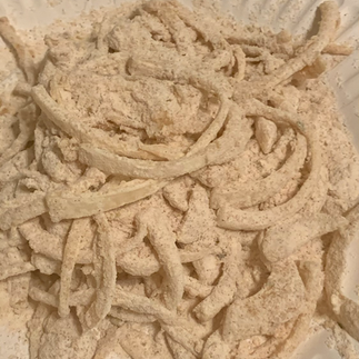 While the bacon baked, I cooked the onion straws. The onions need to be cut very fine and so they cook up pretty quick. I dunked them in egg, shook them in a flour mixture and then into the deep fryer for just a few minutes. They were easy and delicious and I will make them again, no doubt.